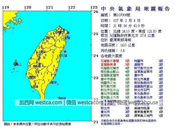 4日当天从凌晨零时起发生有感地震10次、小区域地震15次。其中21:56最大规模5.8的地震(中央气象局后来上修到6.1),震央位于台湾东部海域27.8公里,深度16公里。各地最大震度:宜兰5级、花莲5级、南投4级、桃园3级、台北3级、新北市3级、新竹3级、中市3级、苗栗2级、彰化2级、云林2级、嘉义2级、台东2级、台南2级。