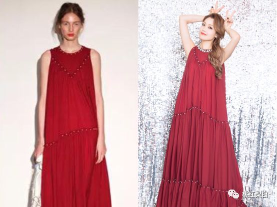 容祖兒選了壹條深紅色連身裙,寬松的裙擺視覺效果還挺靈動的。