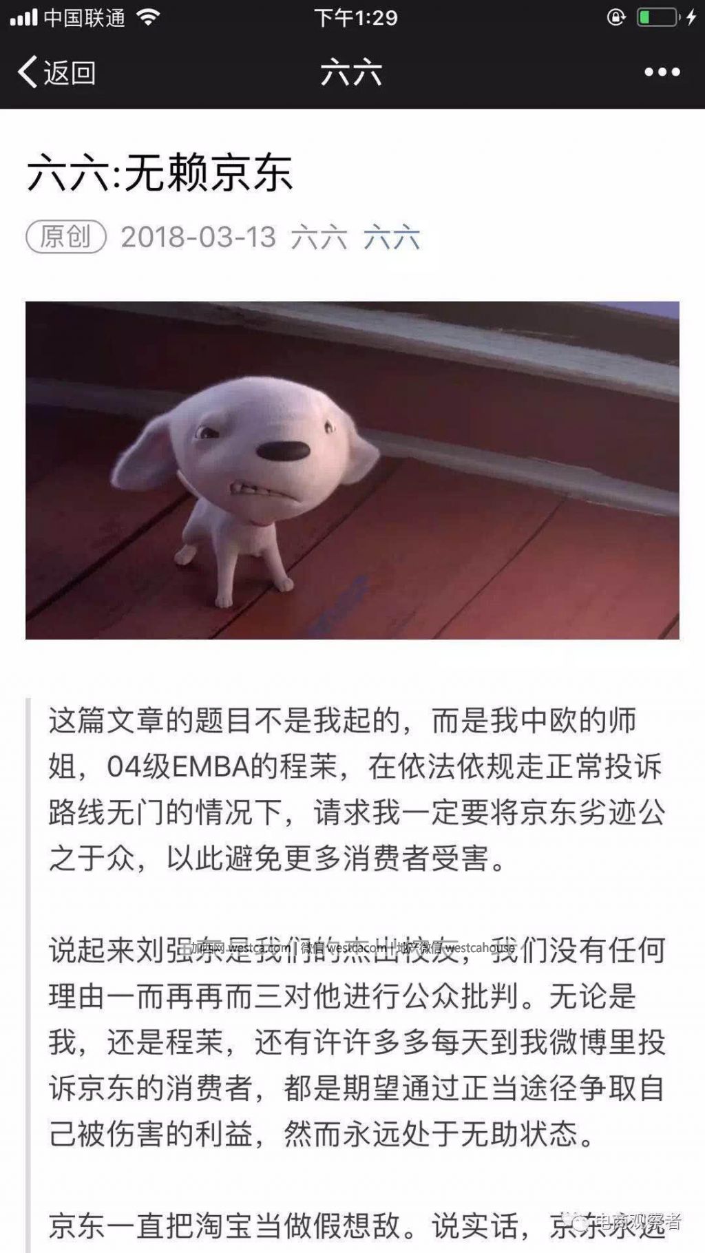 就在劉強東在兩會上大說特說心酸創業史的時候,知名作家六六在個人微信公號上發出“無賴京東”的檄文。在文章中,六六通過其在中歐的師姐程茉的親身經歷,直指京東叁大病灶:商家售假、消費者投訴無門、平台偏袒商家。