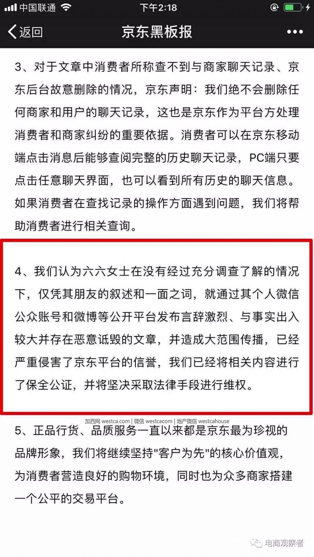 京東最新的回應,則將消費者的投訴全部推翻,並表示,文章內容存在多處嚴重不實,已經涉嫌誇大編造和誹謗,並將相關內容進行了保全公證,並將堅決采取法律手段進行維權。