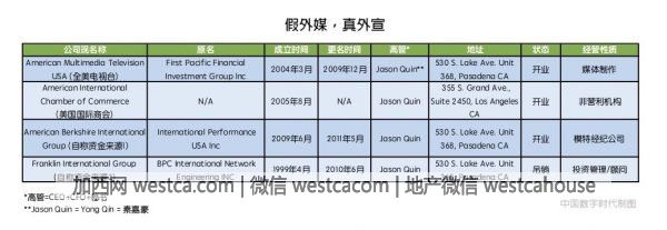 全美電視台官網用蹩腳英語寫成的英文介紹中,稱該公司的“主要資金提供者”為兩家分別名為 Franklin International Group和 American Berkshire International Group的公司。然而經中國數字時代編輯查詢工商登記信息後發現,上述兩家公司都由全美電視台老板 Jason Quin控制,且其中壹家已被加州政府吊銷營業執照。很顯然,全美電視台真實的資金來源並非如其公布的那般簡單。