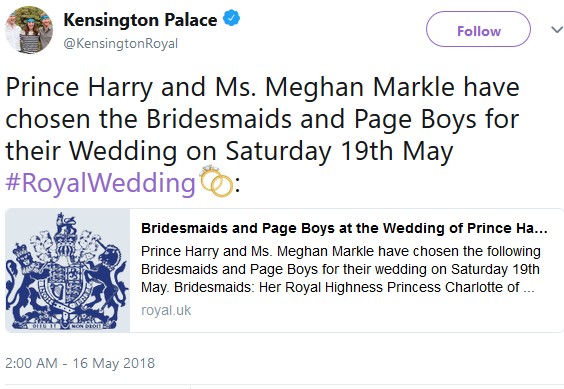 肯辛頓宮已經證實,哈裡王子和王妃梅根已經選中傑西卡.馬爾羅尼的3個孩子在5月19號的婚禮上擔任花童。