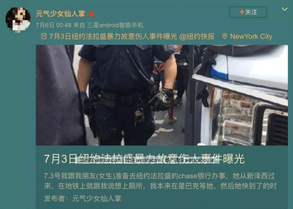 近日,微博上壹篇名為《7月3日紐約法拉盛暴力故意傷人事件曝光》的文章曝光了壹起發生在美國紐約法拉盛的惡性傷人事件。
