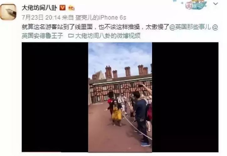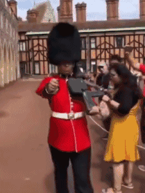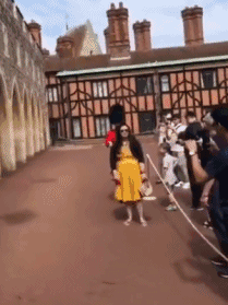 英國皇家侍衛壹個猛推,那個穿黃裙子的女游客立馬壹個趔趄,直接被推出去老遠。。。