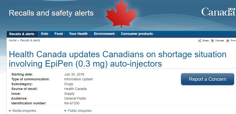 加拿大衛生部表示,EpiPen的制造商輝瑞加拿大(Pfizer Canada )告知,由於制造問題,8月份藥店的piPens成人劑量0.3毫克自動注射器的供應預計將“非常有限”。該公司表示仍將能夠繼續供應為兒童設計的0.15毫克EpiPen Jr自動注射器,但表示供應量也有限,必須由藥店進行謹慎管理。
