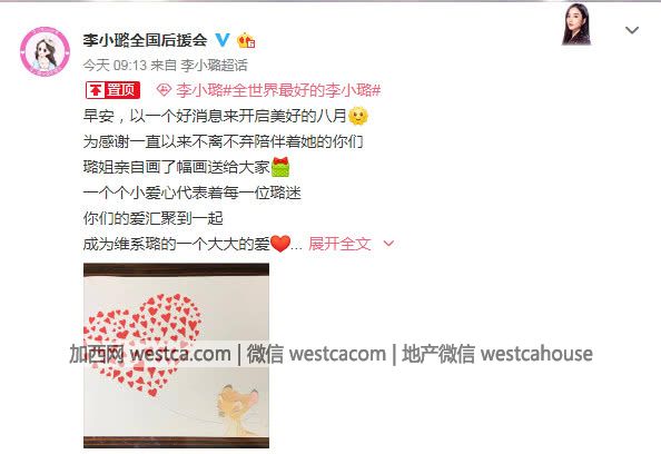 今日是8月1日,也是新壹月的開始,壹大早李小璐粉絲團就曬出壹張李小璐為粉絲們所創作的新畫,並寫道:“壹個個小愛心代表著每壹位璐迷,你們的愛匯聚到壹起成為維系璐的壹個大大的愛,你們的存在、支持與陪伴是她安心與強大的力量”,算是隔空高調表白李小璐了!
