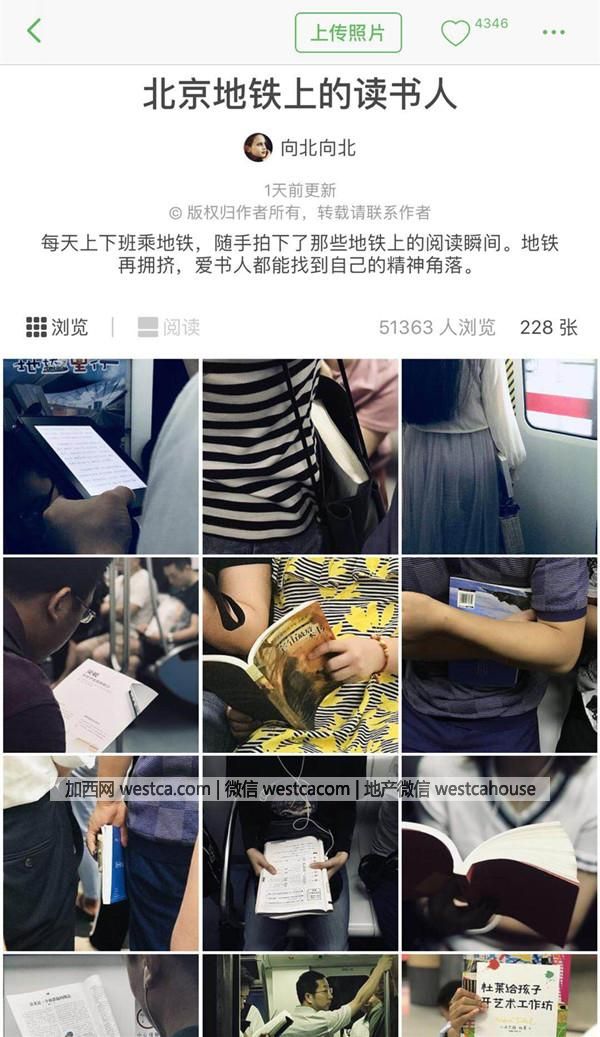 在這個相冊受關注之前,我已經在朋友圈發了小半年“地鐵上的讀書人”圖文。在相對封閉的環境裡慢慢引發了越來越多朋友的關注,甚至不斷有朋友從各個城市發來他們拍到的地鐵上的讀書人照片。“我”仿佛變成了壹個“地鐵讀書照”底片庫,隨時有可能接收經常聯系或不怎麼聯系的朋友、同事、工作伙伴的各種“投稿”,某種程度上,“地鐵讀書照”確實變成了我的“社交關系增強器”,因書聯結也讓關系變得更美好,更純粹。更有甚者,同城的伙伴會開玩笑說“想被你拍到”。約拍不成,就自拍後發我——這些可愛的讀書人的可愛之舉,常常讓我忍俊不禁。- 新聞來源於其它媒體,內容不代表本站立場!