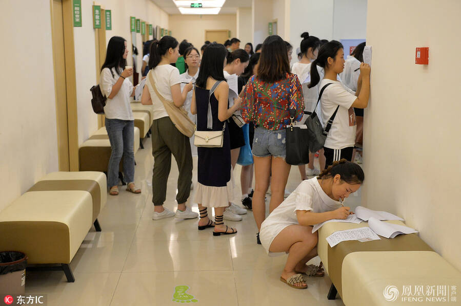 2018年8月9日,四川省成都市416医院体检部,参加女兵征兵体检的应征者在门口排队。