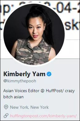 推特用戶 @Kimberly Yam(金伯莉 · 任)是美國新聞網站《赫芬頓郵報》亞洲之聲的編輯,來自紐約。