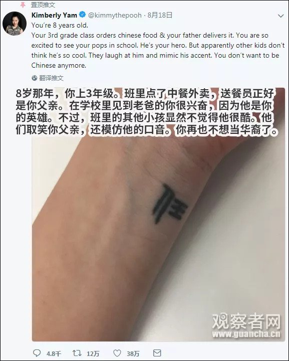 8 歲開始不想當華裔,20 歲卻在手臂上文了自己的漢字姓氏 " 任 "。近日,《赫芬頓郵報》美籍華裔編輯的成長故事在推特上獲得近 12 萬轉發,38 萬點贊。