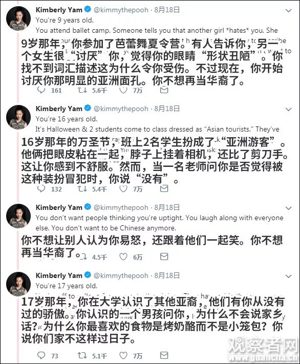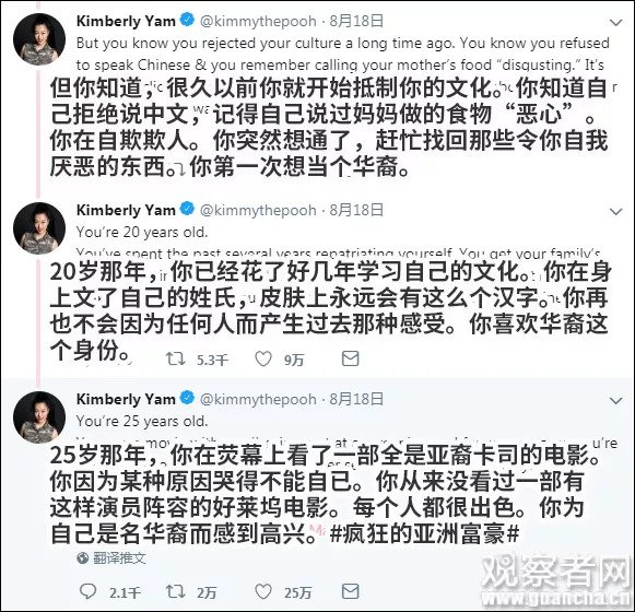 當地時間 8 月 18 日,她在社交媒體上用 8 條消息,描繪了壹名華裔女孩如何在 8 歲到 25 歲的人生中,因自己的種族身份而自我厭棄,最終卻為壹部全亞裔卡司的好萊塢電影而流淚的成長故事。