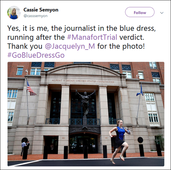塞蒙本人隨後也在社交網站上承認“是的,就是我,那個在馬納福特裁決案後奔跑的、穿藍裙的記者。”
