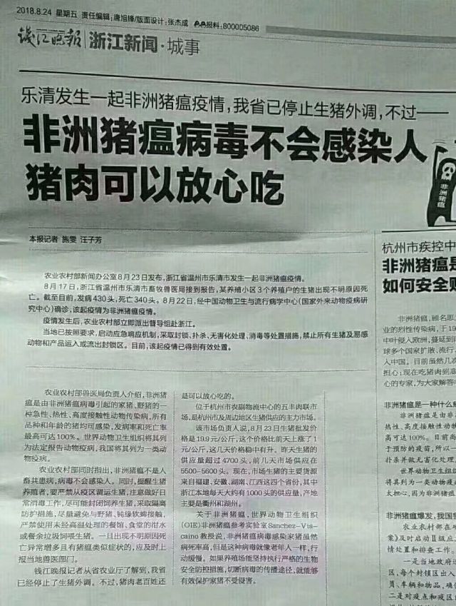 農業農村部還聲稱,非洲豬瘟不是人畜共患病,病毒不會感染人。同時,浙江省農業廳也向該報記者表示,老百姓還是可以放心吃豬肉的。