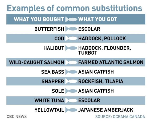 據CBC報道,壹個總部設在多倫多的非營利組織Oceana Canada向消費者發出警告,無論是超市,還是餐館,近壹半海鮮產品名不副實,或以假亂真,或以次充好,有意無意貼錯標簽,要消費者多掏錢,某些情況下很可能導致消費者因誤食而致病。