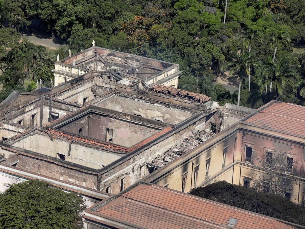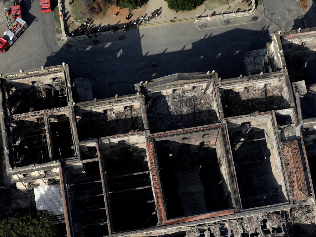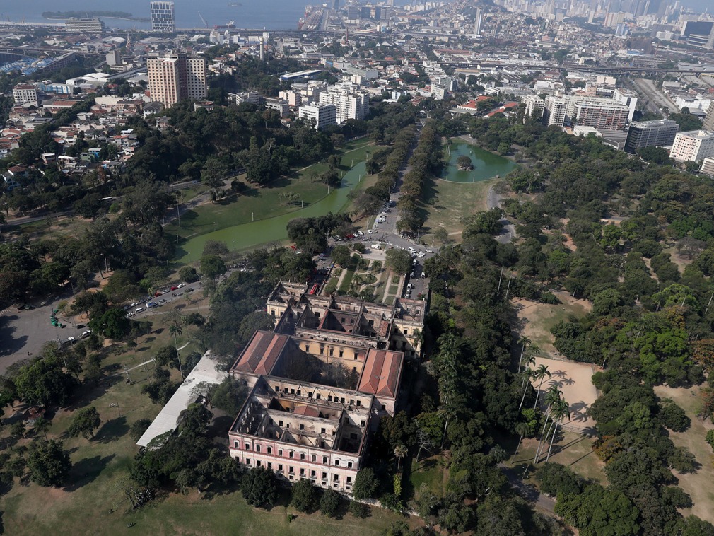 當地時間2018年9月2日,位於裡約熱內盧的巴西國家博物館遭遇火災,損失慘重。9月3日,航拍發生大火後的巴西國家博物館,百年財富毀之壹炬令人唏噓。圖為巴西國家博物館大火後的鳥瞰圖。(圖源:VCG)