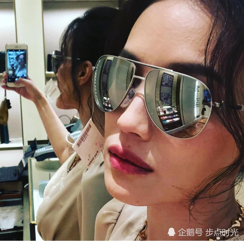 原來舒淇逛街試著壹副帶有商標的墨鏡,她對著鏡子自拍,商標正好把他的嘴擋住了,所以下巴尖尖的像動畫片裡的壞婆婆。