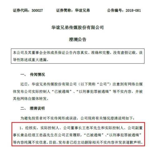 9月10日晚間,華誼兄弟發布澄清公告稱,實際控制人、公司董事長王忠軍和實際控制人、公司副董事長兼總經理王忠磊在公司正常履職,“已被通緝”、“以刑事犯罪被通緝”等內容純屬不實信息。目前,發布者已經主動刪除相關不實內容並發表道歉聲明。
