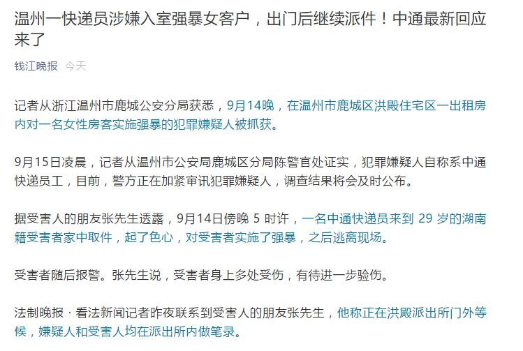 据张先生介绍,受害者张小姐打电话叫快递,中通快递员来到她家,几句言语后就发起了侵害,40分钟后快递员走出她家,继续送快递。张小姐追出去想留证,发现该快递员的电动车没有任何牌照,但还是拍了他的身影和车辆外观。嫌疑人看到张小姐追出来,便当着路人的面说:" 我喜欢你,我会对你负责的。" 然后继续上路送件。钱江晚报记者第一时间联系中通快递公共事务管理中心,相关负责人表示:集团高层获知后高度重视,目前,当地网点正积极协助警方调查。公司将依据警方调查结果严肃处理,不会纵容任何违反法律法规和企业行为准则的行为。我们会及时通报事件的处理进展- 新闻来源于其它媒体,内容不代表本站立场!