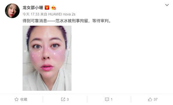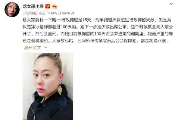 此外,她還另外壹條微博透露范冰冰下壹步將會少數出席公審,到時候就會向大家公開“懸疑”了叁個多月的“偷稅漏稅”案件。