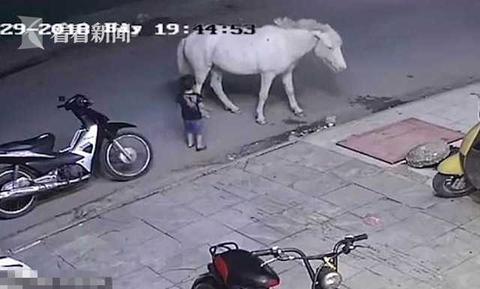 頑皮小孩興奮地跑上前去,對著小馬肚子拍打壹下,然後迅速跑開。環顧肆周發現無人注意,他又笑嘻嘻地返回小馬身後,伸出左手又打了它壹下,閃身離開。
