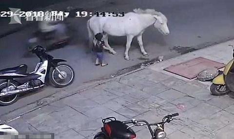 據英國《每日郵報》10月1日報道,事發於9月29日晚8點不到,壹個蹣跚學步的小男孩站在商店街的人行道上獨自玩耍,突然注意到路邊有壹匹小白馬在吃東西。
