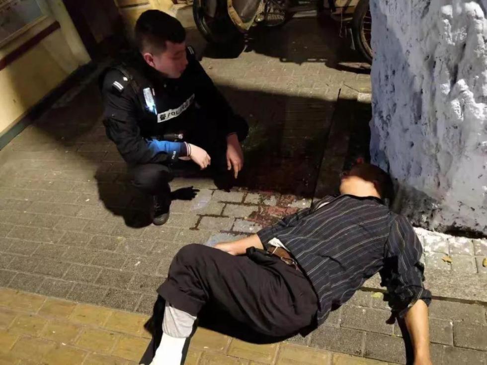 民警徐大偉、曲中直迅速到達現場,發現附近圍了許多路人。壹名60歲左右的男子癱倒在地,身上散發著濃重的酒味,意識模糊,且壹直在嘔吐,應是醉酒倒在路邊。