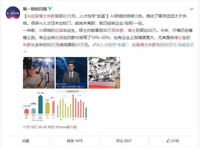 有企業給應屆生的薪水拔高了10%~20%;也有企業上漲幅度更大,尤其是給博士生的薪水從去年的50萬元年薪倏地躥到80萬元;也有准備布局AI領域的新銳企業,雖然還沒考慮好具體的價位,但是打算花高價從互聯網巨頭處搶奪人才。
