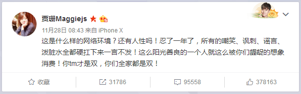在11月28日,賈乃亮的姐姐實在忍不下去了,在看到各種對賈乃亮和家庭的輿論時微博發文,字字可以看得出情緒激動,只希望網友不要繼續給亮亮壓力,不要隨便的去評論壹件事情或者壹個人,希望留給賈乃亮更多的私人空間。