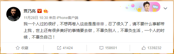 隨後,賈乃亮本人也發文稱“我壹個人過的很好,不想再卷入這些是是非非,忍了很久了,請不要什麼事都帶上我,世上還有很多美好的事情要去做,不辜負別人,不辜負生活,壹個人的時候,不辜負自己!”