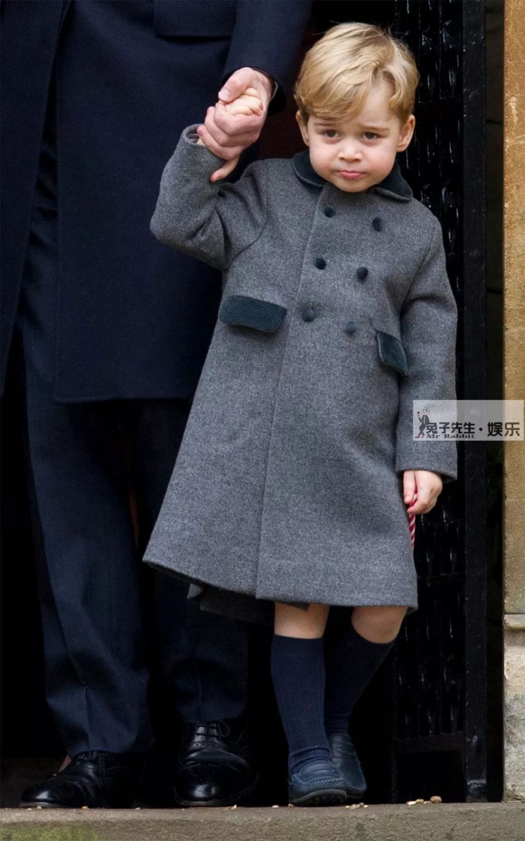 喬治小王子出席王室公開活動時,身穿壹件灰色的雙排扣大衣,萌帥有型,但下身只穿了壹條小短褲搭配小皮鞋,為了抵御寒冷,加了壹雙小腿襪。即使是這樣,小喬治也冷得直嘟嘴,他鼓著嘴巴,似乎不太高興。