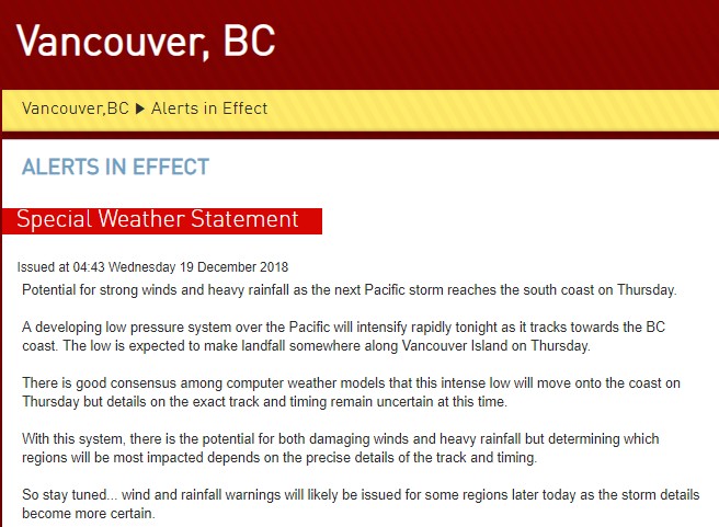 預計第壹場風暴將於明天周肆晚上在B.C省南海岸登陸,目前包括大溫地區和菲沙河谷的特別天氣警告現在正在生效!