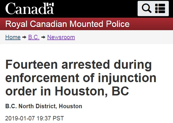 本周壹下午,BC省的皇家騎警在強制拆除檢查站時拘捕了試圖阻攔的14人。