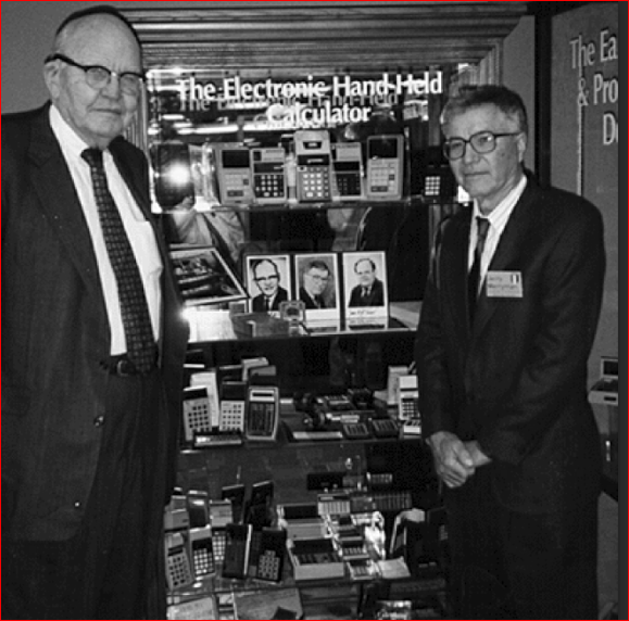 電子計算機的發明人馬瑞曼(右)和基爾比1997年在蒙大拿州的美國電腦博物館,與他們發明的計算機合影