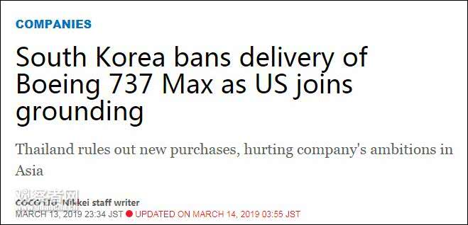 观察者网注意到,韩国方面已宣布拒绝接收新的737 MAX。而泰国国际航空公司也表示将不再采购737 MAX。早前,第三大买家印尼狮航被曝也在考虑取消220亿的波音订单。昨天,狮航方面确认,已冻结未交付737 MAX订单。