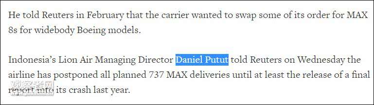 次日,狮航执行董事普图特(Daniel Putut)向路透社确认,该公司已经推迟737 MAX的交付。据观察者网统计,波音仍有211架737 MAX未交付狮航。