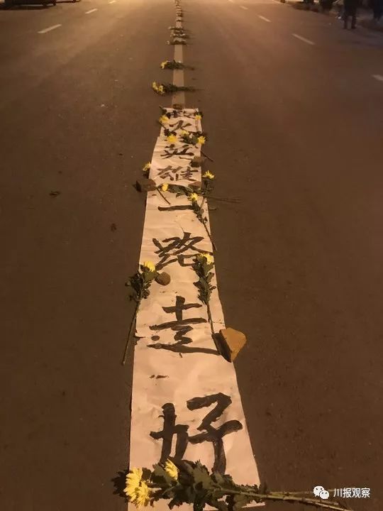 路面上擺放著菊花,寫著挽言:救火英雄壹路走好。