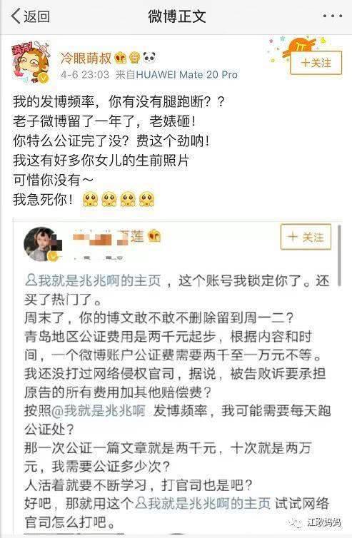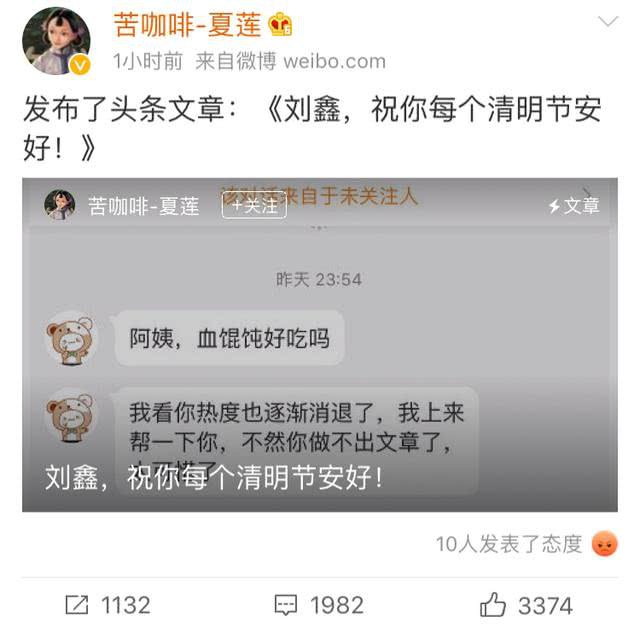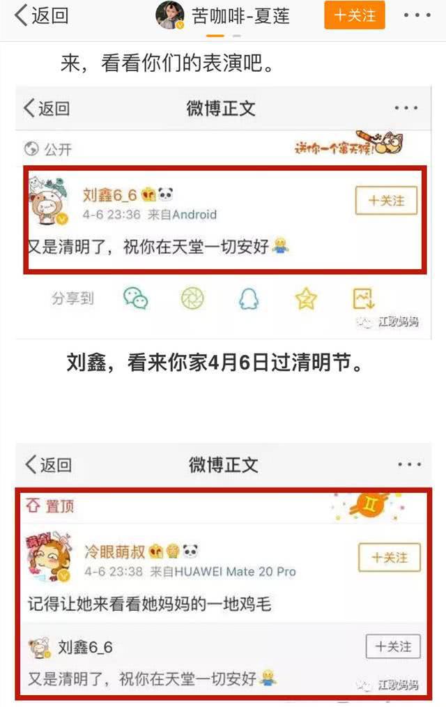 起因是清明節當天,劉鑫先通過微博發了緬懷江歌的微博,然後被壹個小馬甲(ID:冷眼萌叔)迅速轉發並附言辱罵江歌母親。