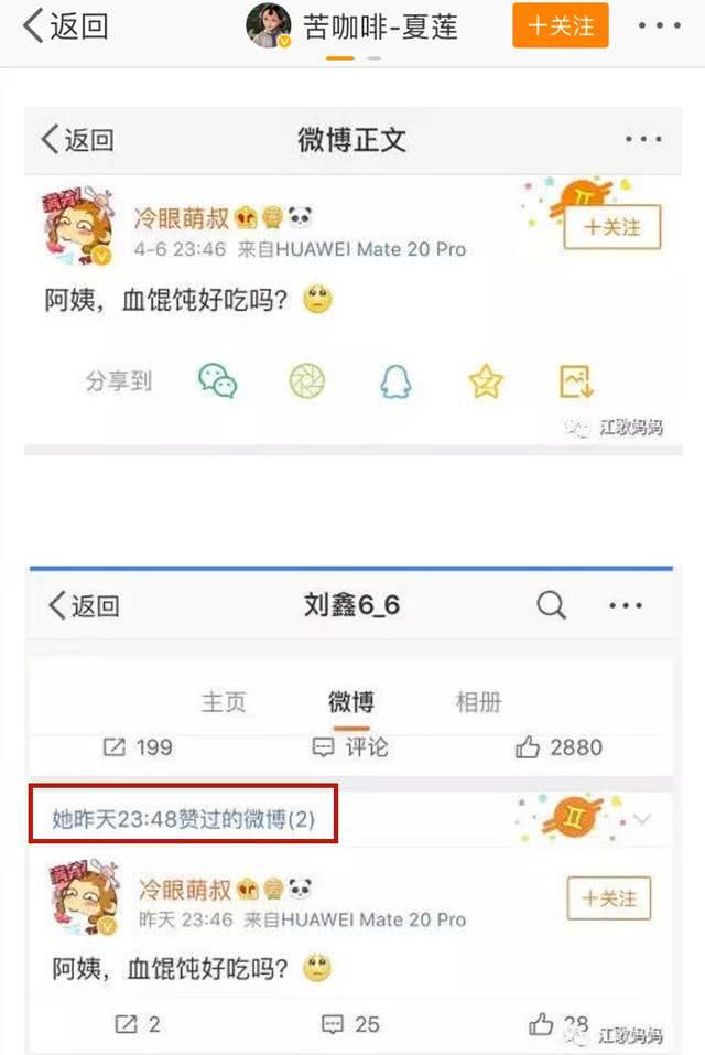 同時,江歌母親還發圖證明,“冷眼萌叔”剛發了壹條嘲諷辱罵她的動態,劉鑫就立馬點贊。這壹唱壹和堪稱默契,仿佛就是同壹個人的操作。