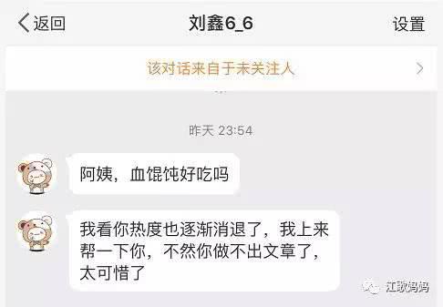 更過分的是,劉鑫通過微博私信向江歌母親叫囂,說“看你現在熱度沒了,我來幫壹下你”。而這個名為冷艷萌叔的博主更是惡毒的稱呼江歌母親為“老biao za”。