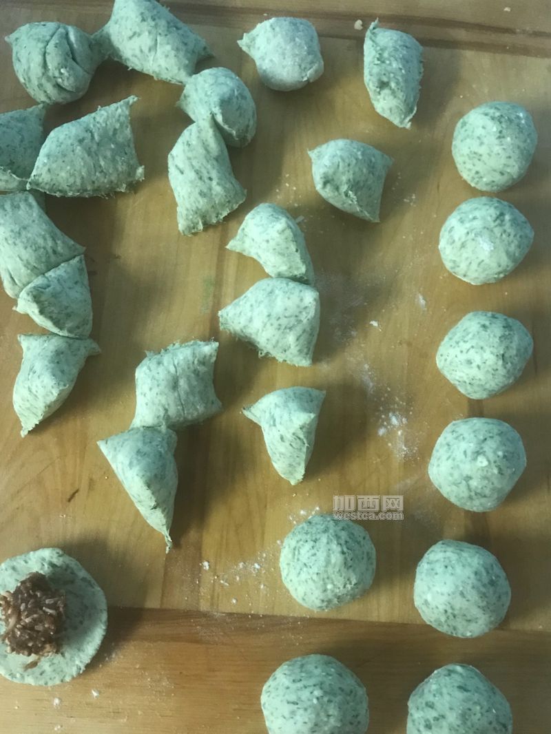 接下來就是包了。把面團分成劑子,擀成面皮,每個裡面放餡,包裹好,放在壹起