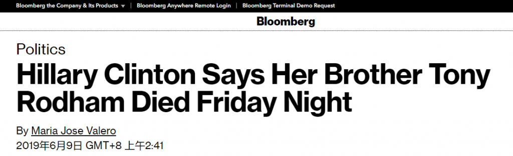 8日,美國前國務卿和總統候選人希拉裡·克林頓在推特上發文,稱其弟弟托尼·羅德姆於7日晚去世,終年65歲,死因不詳。