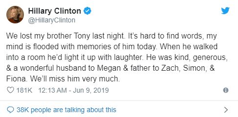 美國彭博社8日報道稱,希拉裡當天在推特上寫道:“昨晚,我們失去了我的弟弟。我很難用什麼詞語描述我的心情,我的腦海中充滿了對他的記憶。每當他走進某個房間,他都會用笑聲將其照亮。他是梅根善良、慷慨的好丈夫,也是扎克、西蒙、菲奧娜的好爸爸。我們都會非常想念他的。”