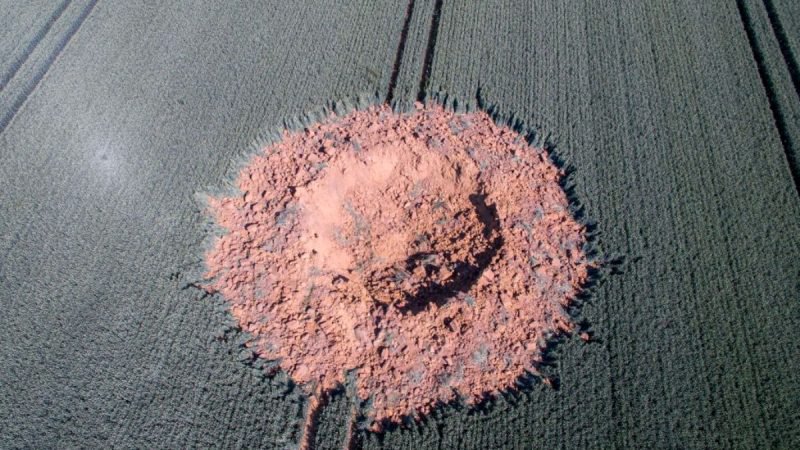 德国阿尔巴赫(Ahlbach)2019年6月23日凌晨4时许,一颗被埋在玉米地中的二战未爆弹发生爆炸,留下一个巨大坑洞。图为爆炸现场的鸟瞰照片。