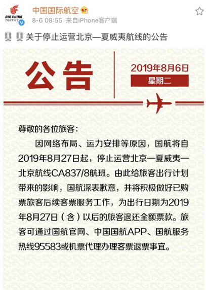 國國際航空公司8月6日早上8時55分在其官方微博@中國國際航空 發布公告稱,因網絡布局、運力安排等原因,將自2019年8月27日起,停運北京-夏威夷-北京航線CA837/8航班。
