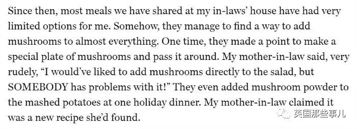 有壹次,他們特意做了壹道特制蘑菇拼盤來回傳著分。我婆婆非常粗魯地說:“我喜歡直接往沙拉裡加蘑菇,但有人不樂意!”