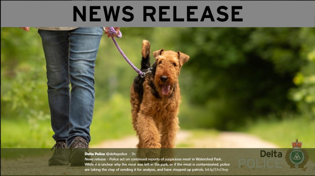叁角洲流域公園(Watershed Park )今年夏天發生了肆宗可疑肉類案件,叁角洲警方正在調查誰把這些肉塊丟在公園以及這樣做的原因,同時警告民眾到公園要保持警惕。