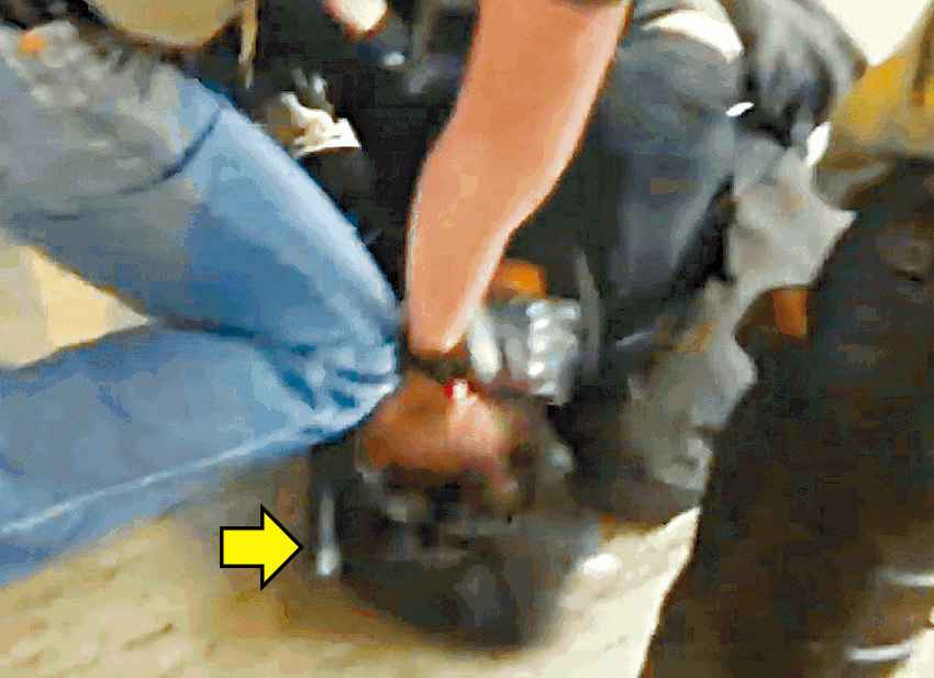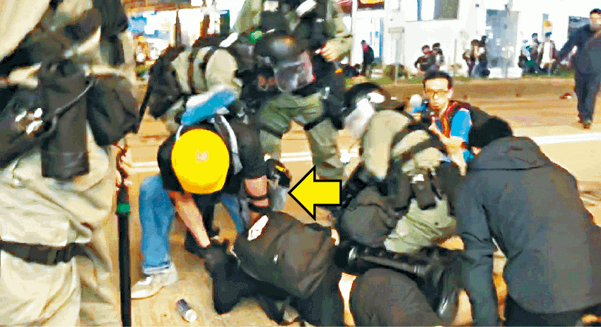 家樂仔8.11被臥底警以膝壓頭制服,其間更遭防暴警揮棍(箭嘴示)打頭
