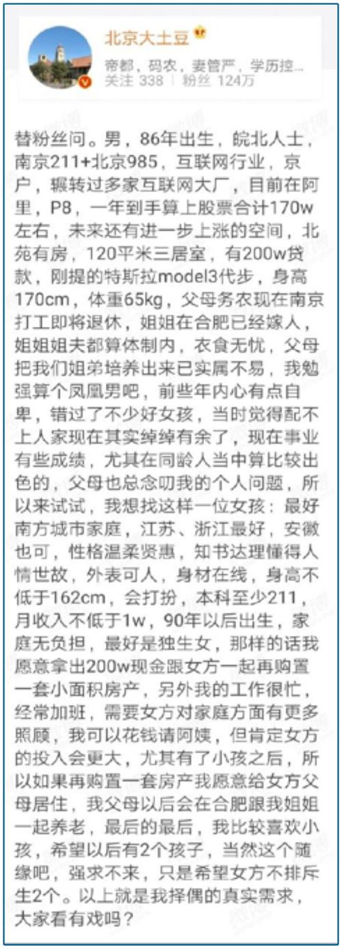 最近幾天,微博上壹個相親的帖子火了。