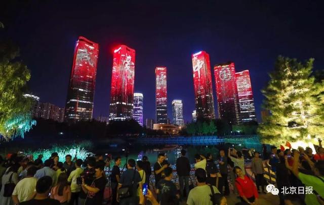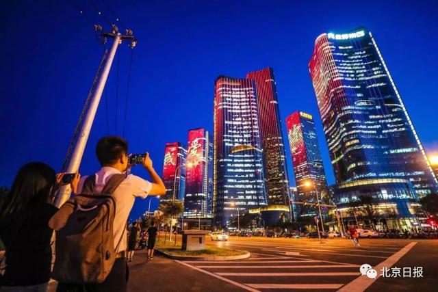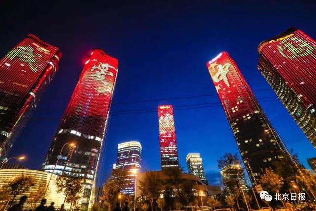 在京城第壹門——科技創新產業集聚的大望京,金輝大廈、忠旺大廈等10棟大望京門戶建築被璀璨燈光點亮,形成“國門”意象,開門迎賓展現大國胸懷。“我、愛、你、中、國”這幾個字,匯成壹條紅色的燈河,向祖國表達款款深情。
