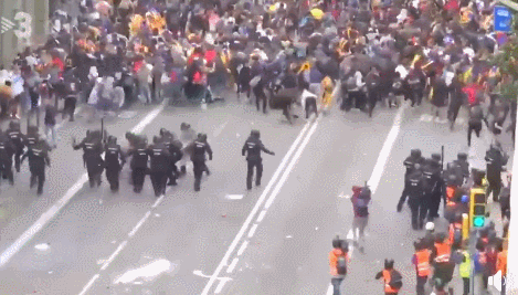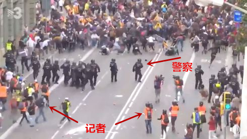 通過視頻可以看見,西班牙警察在前進過程中,記者們自動從壹旁撤回到警察身後,防止擋路: